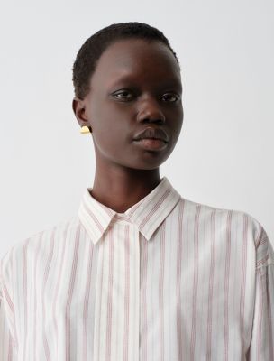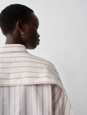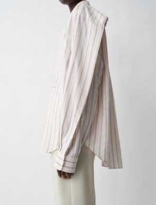 Relaxed button-down shirt in silk and cotton with slightly dropped shoulders, horizontal pleat detail at back yoke and concealed front placket with mother-of-pearl buttons.