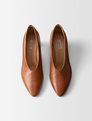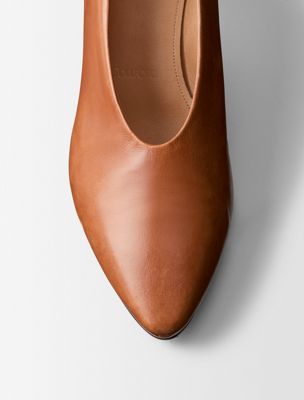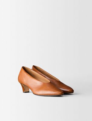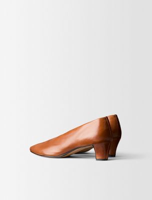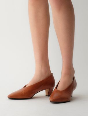 The Bri Pump is made with a slightly rounded, elongated toe, crafted from buffalo leather. Distinguished by a unique design featuring a seamless upper and encapsulated heel construction.