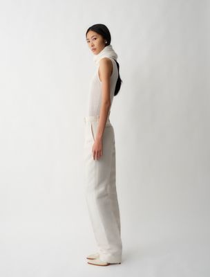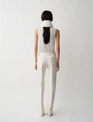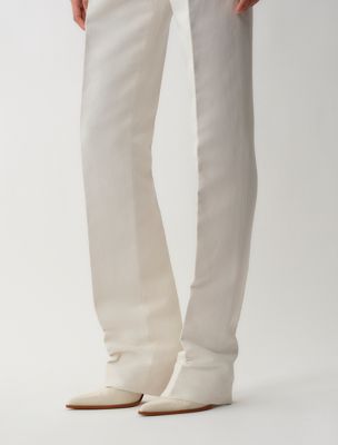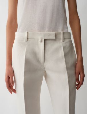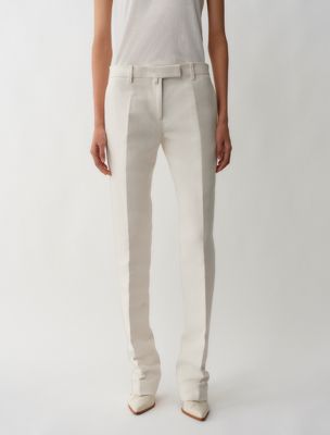 Tailored low-rise pant in structured silk and paper fibre with a skinny leg, side slant pockets and pressed front and back creases.