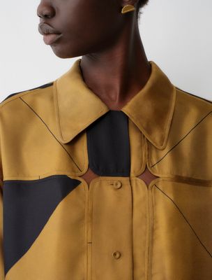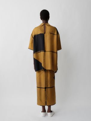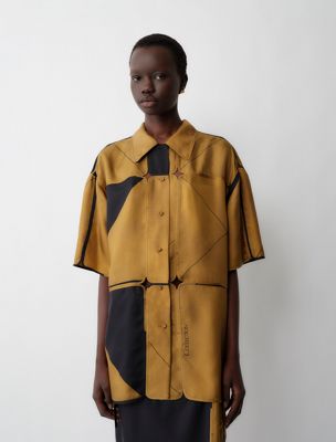 Relaxed, printed patchwork bowling shirt in silk with short sleeves, exposed front placket with covered buttons and a keyhole opening with button at back neck. Crafted with individually finished tiles, hand sewn together.