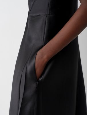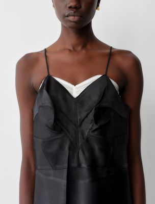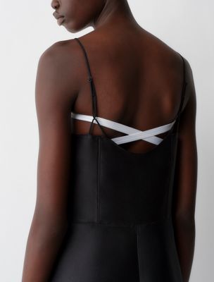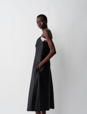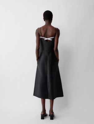 Calf-length slip dress in double satin with lingerie-inspired seaming, slightly A-line hem, skinny elastic straps with adjusters and a centre back vent. Garment is finished with intentional creasing.
