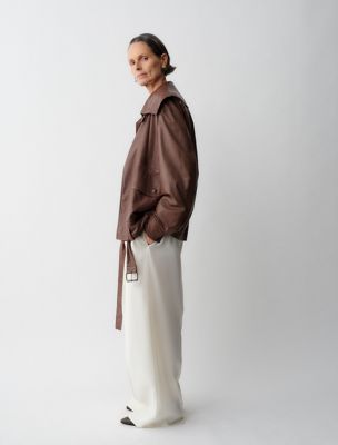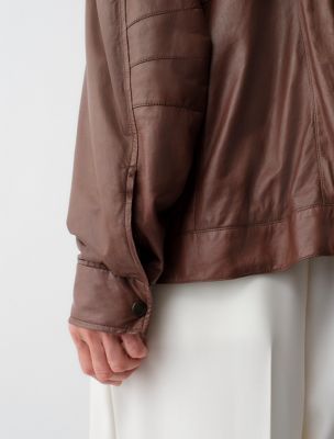 Relaxed bomber jacket in washed extra soft nappa leather with exaggerated rounded sleeves, double collar and oversized patch pockets. Internal drawcord at hem, belt with metal buckle and eyelets.