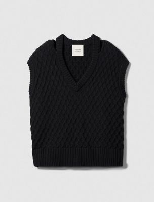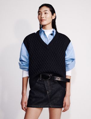 Calvin Luo for Calvin Klein. Inspired by the new year of the snake. A day-to-night celebration of tradition, through a modern lens. Made from 100% merino wool, this relaxed vest has a soft, sumptuous touch. Accentuated with a distinct cable knit and detailed with cut-outs along the neckline.